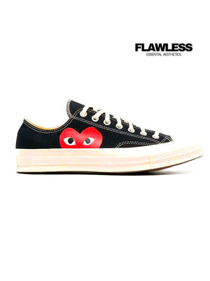 ▪︎ivory/red canvas Chuck Taylor 70 high-top sneakers from COMME DES GARÇONS PLAY featuring round toe, logo patch to the side, front lace-up fastening, contrast stitching, heart print, ankle-length and rubber sole.