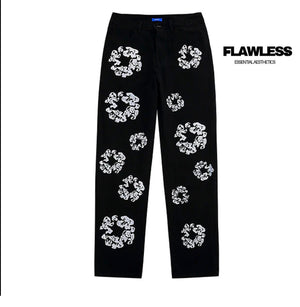 ▪︎The Black Denim Tears X Levi's Cotton Wreath Jean features a Cotton Wreath embroidery detailing throughout, which is done in a white color. The front of the jeans has two pockets, while the backside has one more pocket. The pants also have sturdy stitching and reinforced seams. They also include a zipper fly and a button closure. Additionally, the waistband of the jeans is fitted with belt loops that allow you to adjust the waistband to your specifications. The pants also have tapered legs and have a Levi's Red Tab at the back of the waistband.