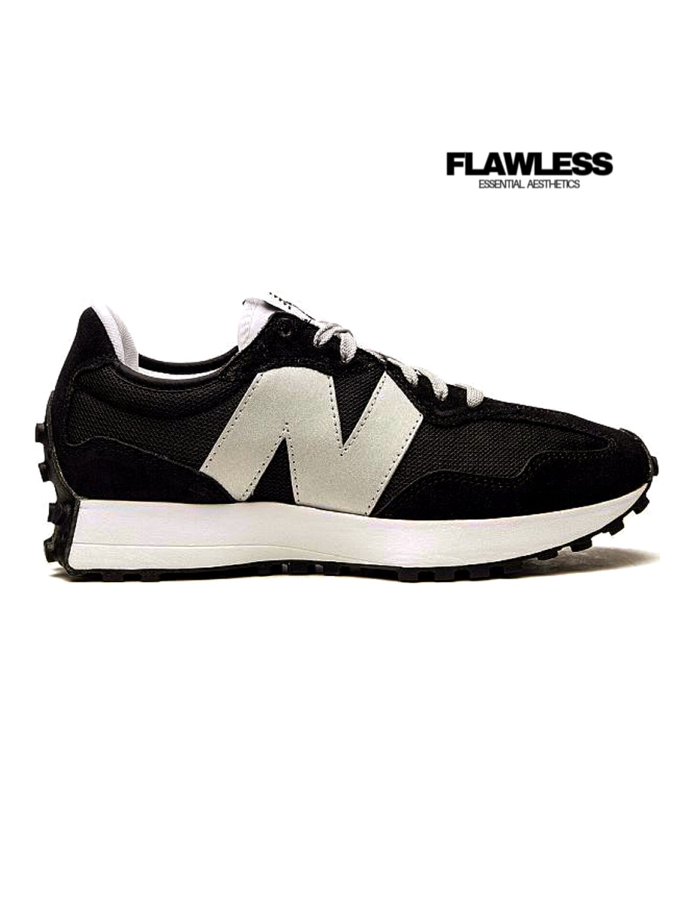▪︎The 327 sneaker is a modern take on an all-time classic. This black pair brings New Balance heritage sneaker silhouette from the '70s into the future with an updated hairy suede and textile upper, creating a retro look that's ready for the streets today, while the oversized 'N' logo adds a bold finishing touch.